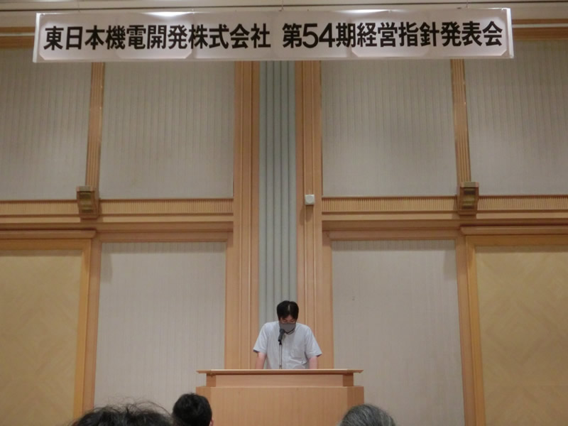 午後からは経営指針発表会です。全員による社是唱和の後、社長から基本方針を発表、続いて各部門の活動方針、全社員の個人目標発表が行われました。そして最後に社員代表の元気な決意表明で第54期のスタートを切りました。