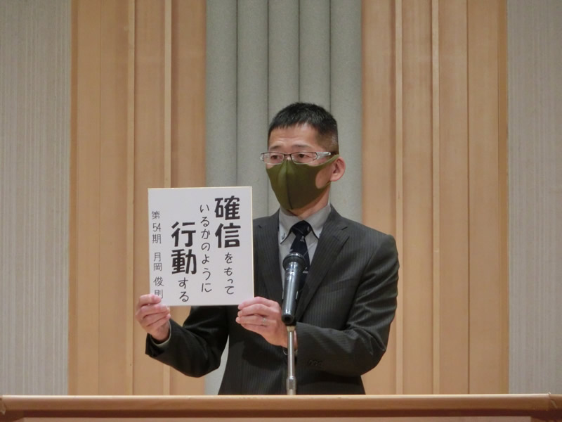 第54期のスローガンは「自分を生かす」。チームワークはチームのために自分を殺し、献身的な姿勢が美化されるが、個人の特質を生かすことこそが本当のチームワークではないか。上からやれと圧力をかけられてやる仕事では本当の力は発揮できない。個人のモチベーションが内から出てくることで最大の成果が出る。内なる動機で自らを律し、「自分を生かす」一年にします。