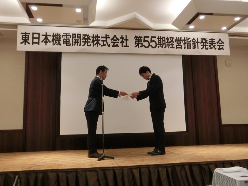 午後からは経営指針発表会です。全員による社是唱和の後、社長から基本方針を発表、続いて各部門の活動方針、全社員の個人目標発表が行われました。そして最後に社員代表の元気な決意表明で第55期のスタートを切りました。